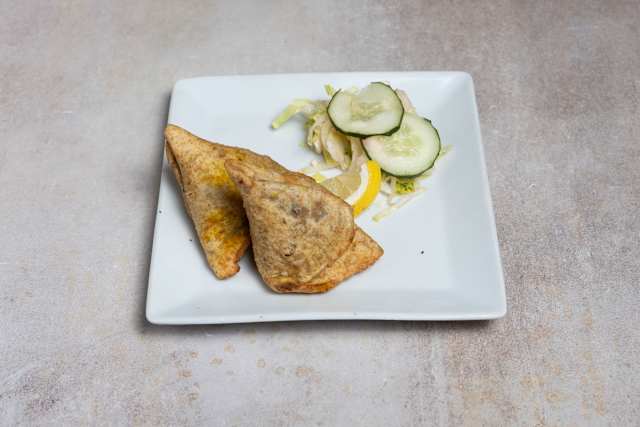 - Crujiente masa rellena de patatas y guisantes especiados, frita hasta dorar.