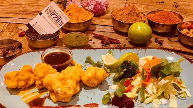 - Blumenkohlfritters in kichererbsenmehlteig, serviert mit tamarindensauce.