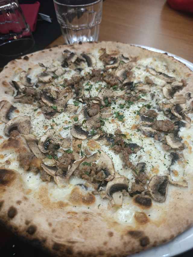 Funghi Champignom, salsiccia, provola, pepe nero, caffè e prezzemolo.