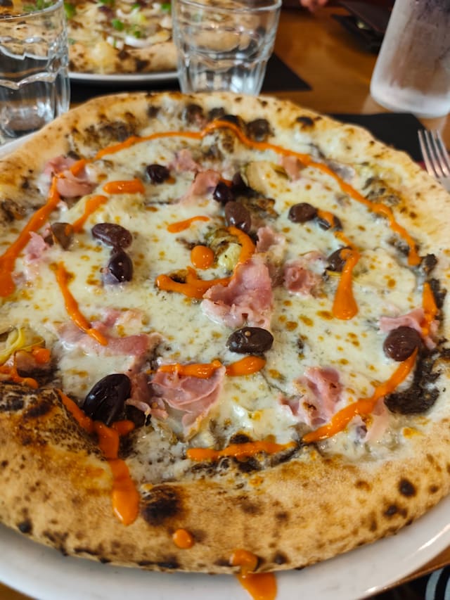 Crema di funghi champignon, carciofi alla brace, olive taggiasche, prosciutto cotto, crema di pomodori confit, fiordilatte e basilico. A richiesta uovo alla Bismarck + € 1,00
