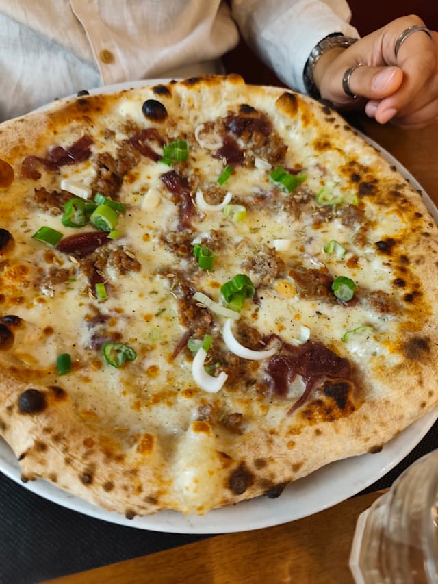 Salsiccia al finocchietto, provola affumicata, cipolla caramellata, cipollato e pepe nero.