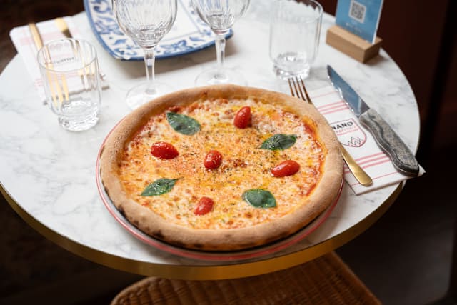 Tomate San Marzano, Après cuisson : Jambon Cru Gran Milano, Tomates Datterino, Roquette, Mozzarella di Bufala DOP, Parmesan Reggiano, Vinaigre Balsamique