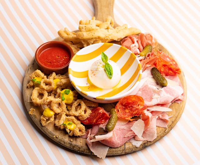 Belle planche composée de Stracciatella, Zoccolette & Focaccia. Avec de la Charcuterie Fine Italienne* : Mortadella Naturals à la pistache, Jambon Cru Gran Milano, Jambon Blanc Gran Biscotto à la Truffe*