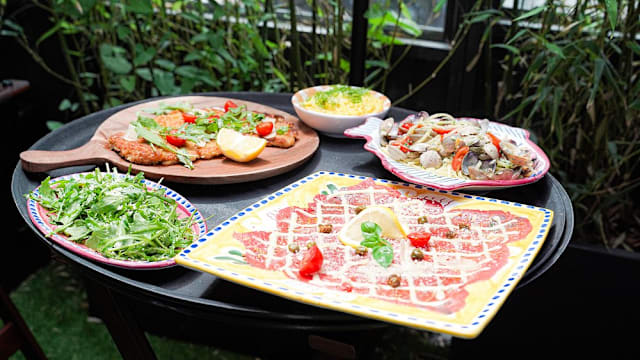 - Tomate san marzano, après cuisson : jambon cru gran milano, tomates datterino, roquette, mozzarella di bufala DOP, parmesan reggiano, vinaigre balsamique