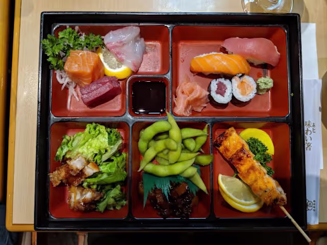 - Riz vinaigré avec saumon, edamame, concombre, salade d’algue, carotte et radis