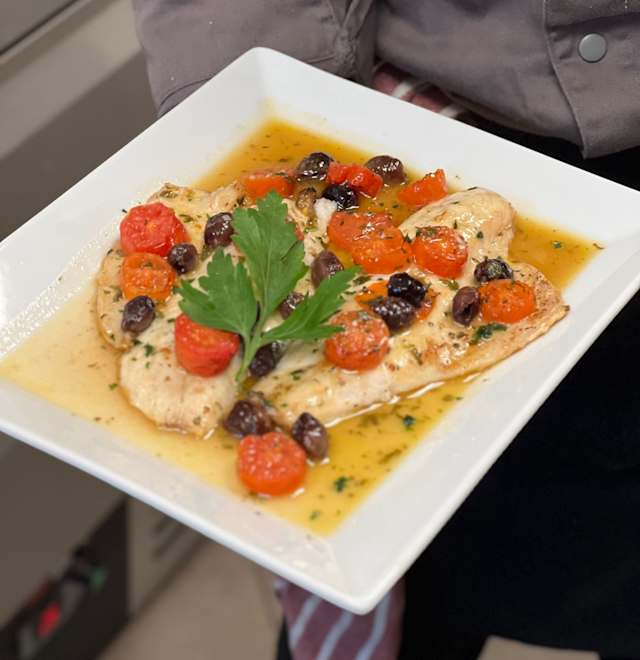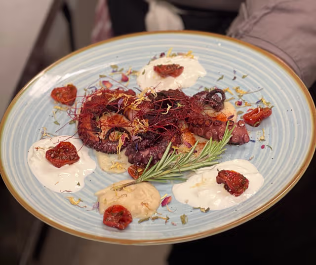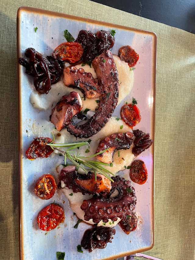- Tentacoli di polpo arrostiti, parmentier di patate, burrata, pomodori di pachino confit