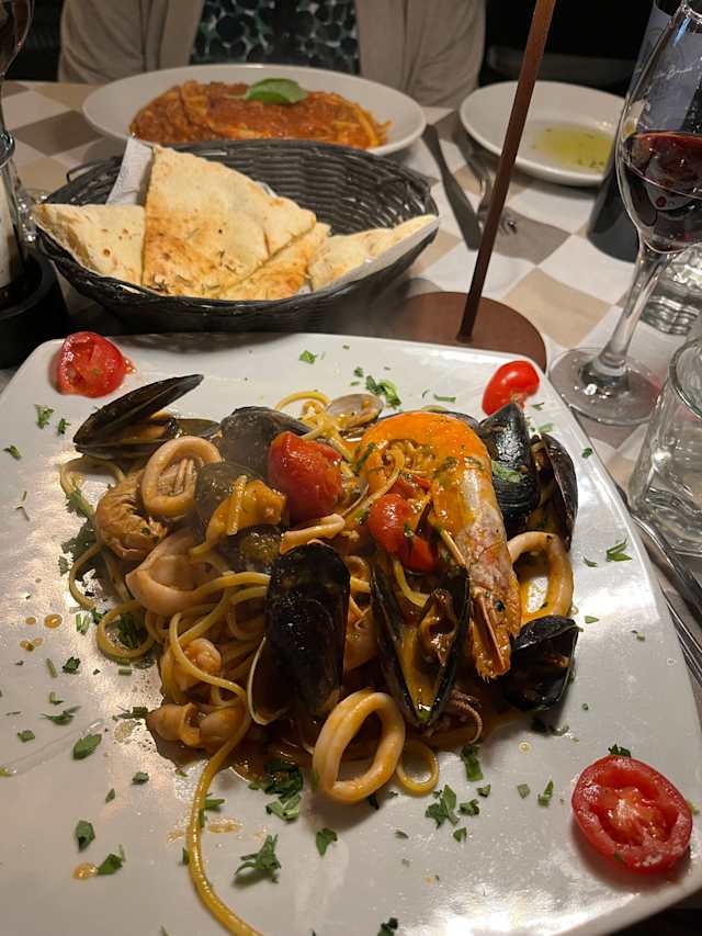 9.5/10Our waiter was amazing and attentive and the host was so personable. He was so excited when my dad bought my mom a rose from a street vendor. The food was incredible. The fresh made pasta was better than what we have in the US. Sitting in front of the Pool pantheon was sureal. The only downside was that the fountain was blocked due to renovation.