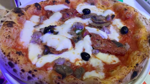 Pomodoro, fior di latte, funghi, salame, salsiccia e olive nere