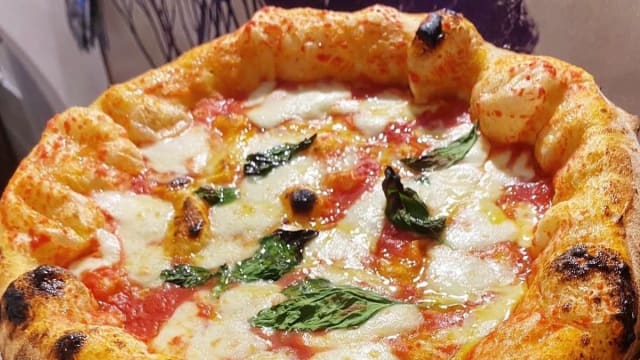 Pizza cotta in due temperature con pomodoro san marzano dell’agro sarnese nocerino DOP, cotto a bassa temperatura. In uscita mozzarella di bufala DOP, scaglie di parmigiano e pesto artigianale di basilico fresco