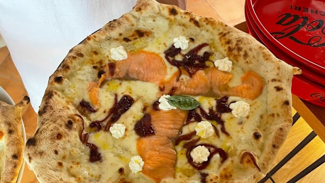 Fior di latte campano, salmone affumicato, cipolla rossa caramellata, crema di formaggio a fiocchi, basilico, olio evo