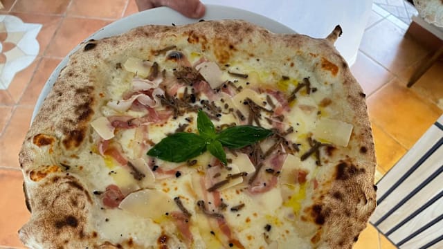 Provola affumicata dei monti, pancetta di suino nero dei nebrodi, scaglie di parmigiano, scaglie di tartufo in uscita, olio evo, basilico