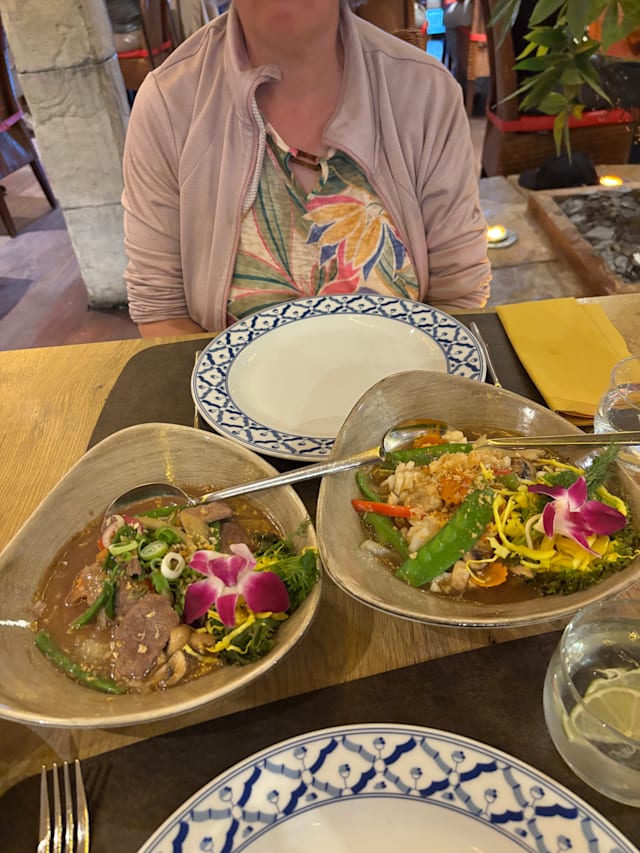 3/10I think I was spoiled by other Thai restaurants in the area. We were sat upstairs as no tables left downstairs so no atmosphere at all. There was one waiter allocated to upstairs so we were forgotten about. Had to go find a waiter to take order. Food wasn’t great. Had better Thai. It wasn’t hot when it arrived. The decor downstairs is fabulous. Koi karp in fountains etc. but upstairs not atmospheric. Wouldn’t return sorry