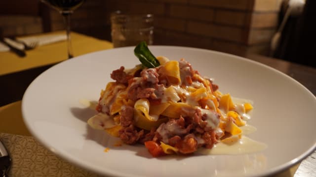 La nostra tagliatella avvolta in un ragù di salsiccia nostrana, con una nuvola di spuma al parmigiano che accarezza il palato.