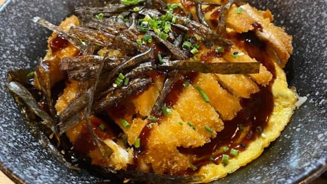 - Caldo de frango, massa, frango panado, ovos cozidos, cebolinha, bambu, folhas de nori, milho, rebentos de soja