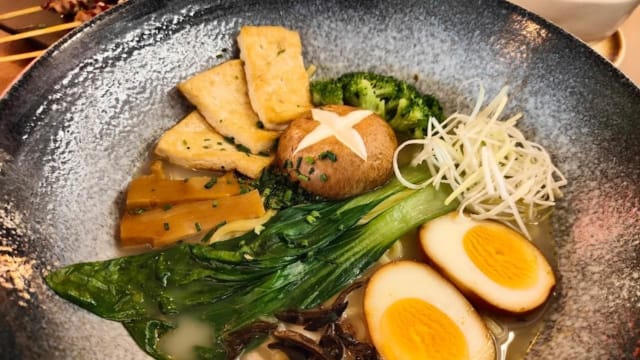 - Caldo vegetal, molho de caril, massa, toufu, cogumelos, milho, rebentos de soja, ovo cozido, pak choi