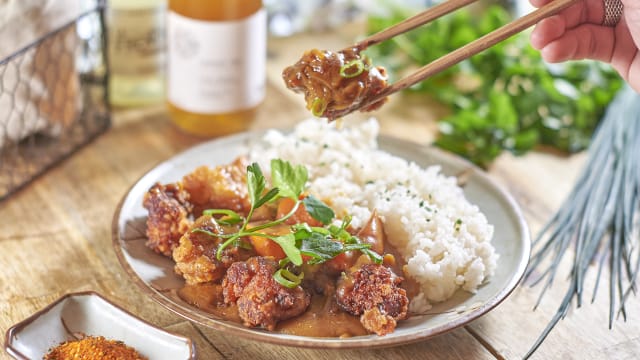 En collaboration avec one and one burger. Quand le meilleur burger de paris rencontre le meilleur poulet frit japonais de paris :) bun boulanger bio, poulet bio fermier mariné trit, cheddar et sauce curry japonaise. Servi avec des frites malsons, de la mayo fumée et du ketchup à la framboise