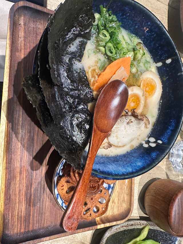 - Un ramen avec un riche bouillon de porc. Nous le faisons mijoter 48h pour révéler toute sa saveur. Avec 3 tranches de pore blo et fermier braisé, des herbes fraiches. De la patate douce, des tranches de bambou marinées et de l'huile de sésame noir a l'ail
