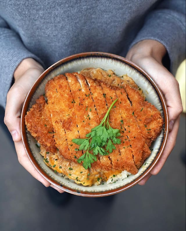 Pore bio et fermier pané Japonais. Enrobé de panko (panure typique Japonaise très légère). Tendre et croustillant, servi avec du choux chinois, du riz blanc, de la mayonnaise Japonaise et de la seuce tonkatsu. Plat star des brasseries à Tokyo