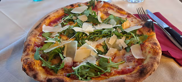 - Pom., mozz., prosciutto crudo, pomod. fresco, rucola, grana a scaglie