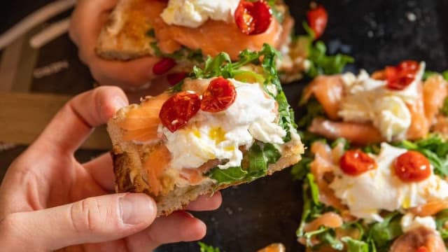 Pinsa, tonno, pomodoro giallo e rosso, cipolla di tropea