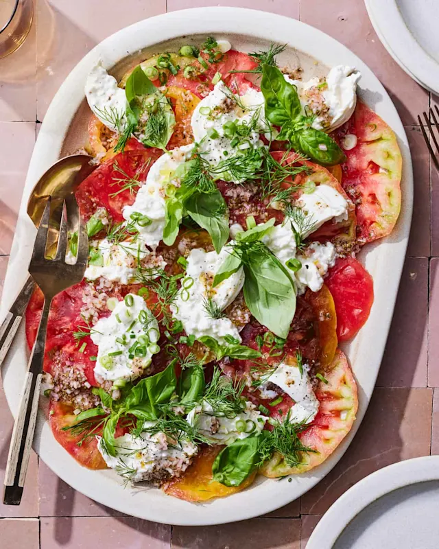 - Tomates fraîches, roquette, burrata, vinaigrette balsamique, pesto vert