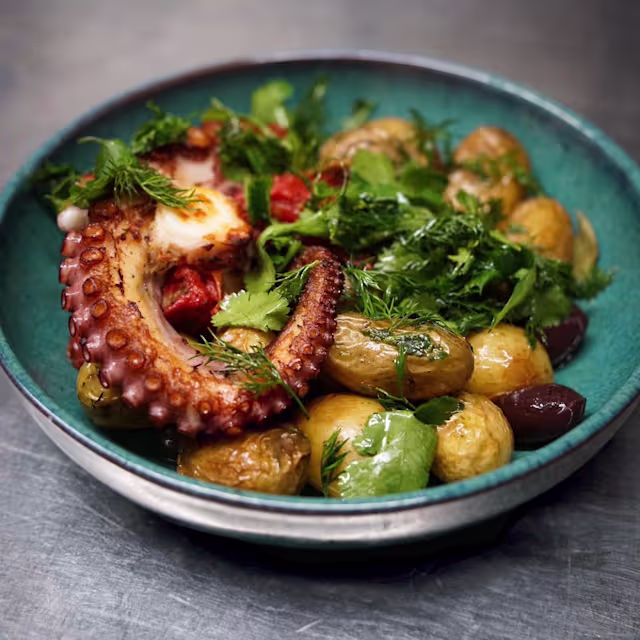 - Poulpe grillé, olives de kalamata, pdt grenaille rôties, sumac
