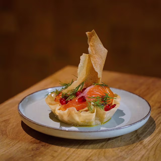 - Gravlax de truite française, feuille de brick, yaourt à la menthe, fenouil confit au citron