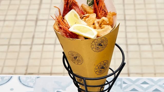Calamaro fritto, gamberi rossi fritti, salicornia in pastella, sale marino di trapani, presidio slow food e maionese allo zenzero.