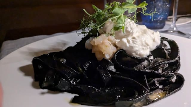 Tagliatella al nero di seppia, gambero rosa di sciacca, cipolla, olio, sale, pepe, salsa di pomodoro e stracciatella.