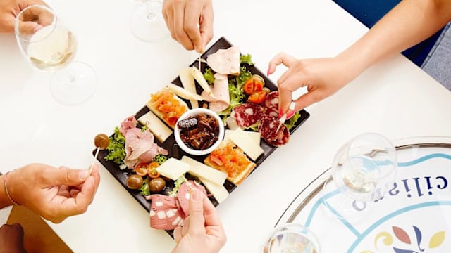 Perle di bufala, datterino giallo, rucola, pesto di basilico, prosciutto crudo di parma 18 mesi, grana padano 18 mesi.