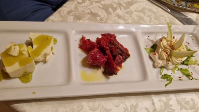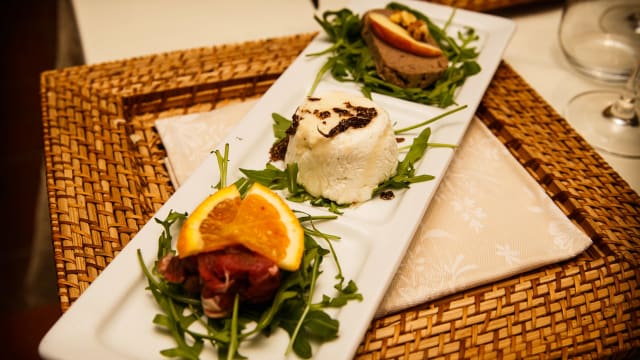 Mousse di ricotta, carpaccio di vitella, pannacotta salata, sformatino vegetariano, uova di quaglia, polpettina di melanzana, julienne di verdure, fonduta di pecorino, patata al tartufo, mini quiche vegetariana, scrigno di scamorza