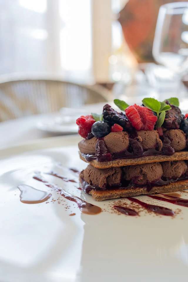 - Biscuit al cioccolato, mousse al fondente e gel di frutti rossi