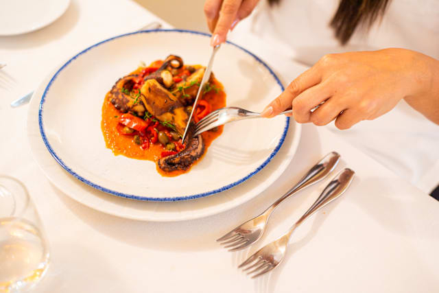 Tentacolo di polpo rosticciato alla salentina (crema di peperoni, capperi e olive leccine)