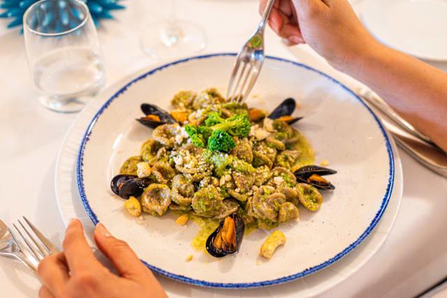Orecchiette di grano arso con crema di cime di rape, cozze e tarallo sbriciolato