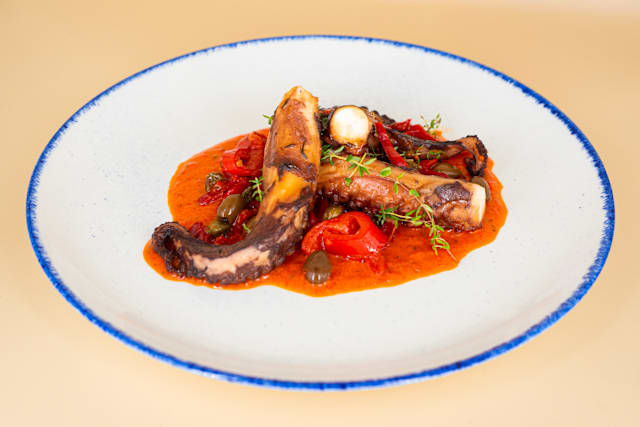 Tentacolo di polpo risticciato alla salentina (crema di peperoni, capperi e olive leccine)