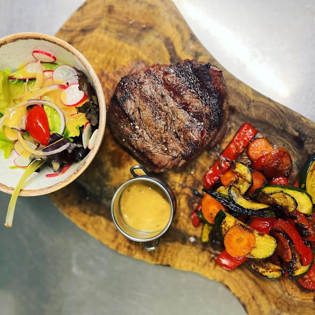 Servis avec frites maison ou écrasé de pommes de terre ou gratrin dauphinois, légumes ou salade. Sauce au choix - cheddar / morilles / poivre vert