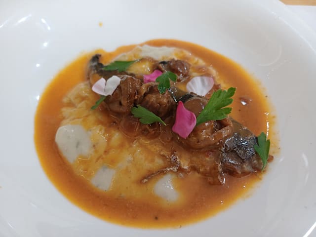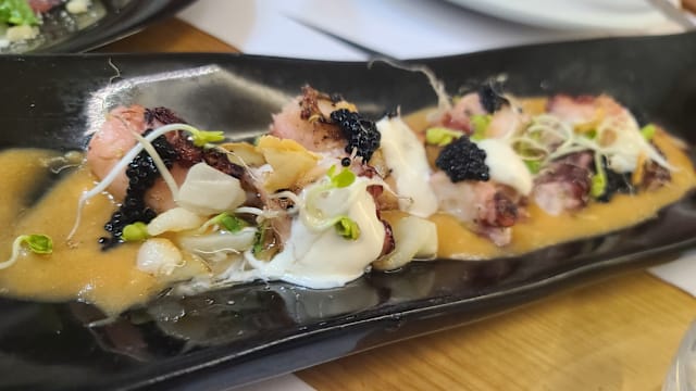 Calamar de playa a la brasa con crema de bogavante y mayonesa de tinta