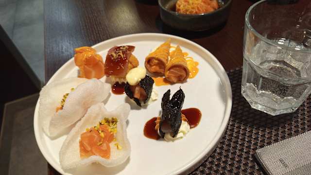 - Roll di salmone flambe con gamberetti in tempura guarniti con teriyaki