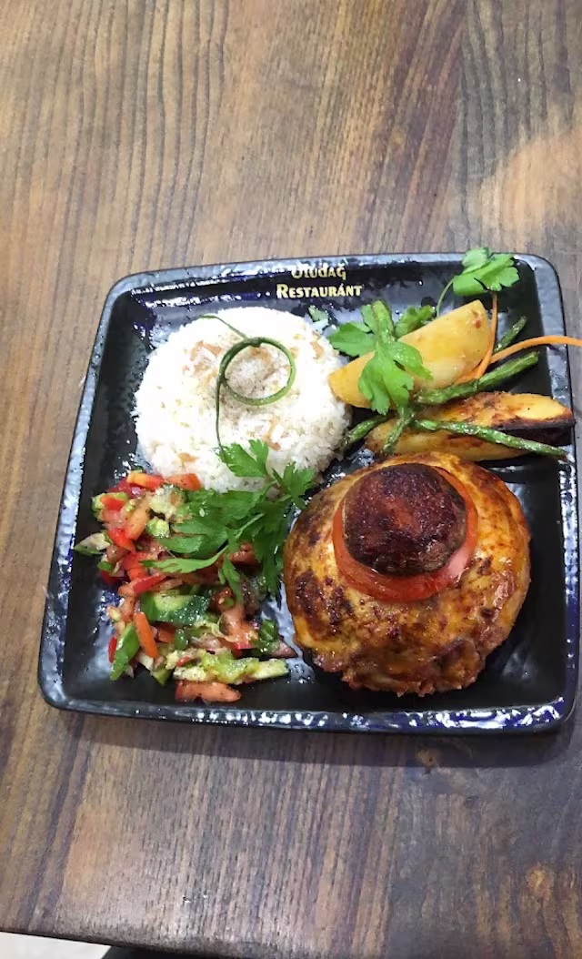 - Kebab sur lit de pain, avec sa sauce tomate au beurre, servi avec du yaourt nature