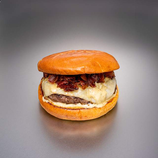 - Carne de vaca a la parrilla con queso cheddar, huevo frito, bacon ahumado y mayonesa casera de trufa.