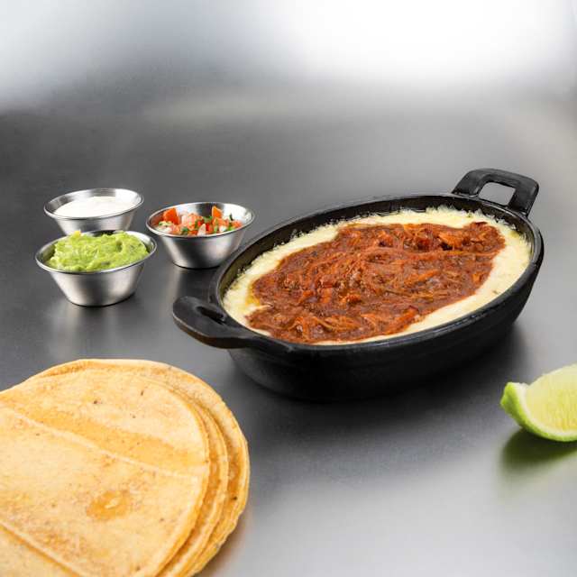 - Carne de cerdo desmenuzada y ahumada en salsa BBQ, acompañados de queso mexicano, guacamole, pico de gallo y crema agria.