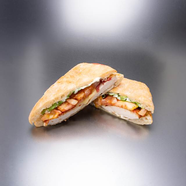- Pollo empanado con salsa marinara de tomates, queso mozzarella, queso parmesano, alioli de pesto rojo, mayonesa de albahaca y pan de cristal.
