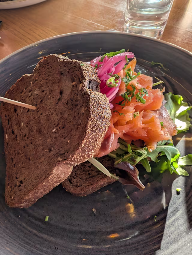 - Gerookte zalm | rode ui | kappertjes | komkommer | dillesaus