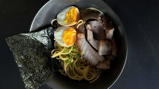 Zuppa di carne di suino, pollo, spaghetti di soba, porchetta marinata con spezie, cipollotto