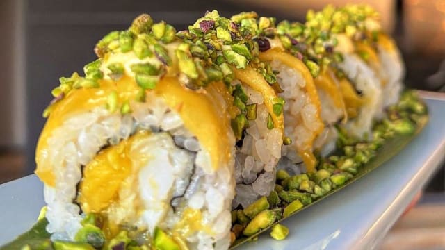 Roll in tempura con tonno, e mango, ricoperto da tartare di salmone, salsa spicy e teriyaki