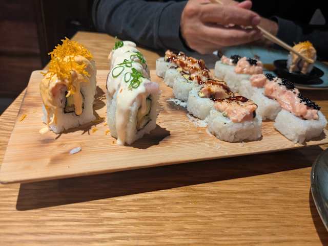 7/10Great delicious Sushi. I didn’t try their fusion dishes, just the sushi. Unfortunately they didn’t have Blue Fin Tuna available tonight. And they did forget one order.