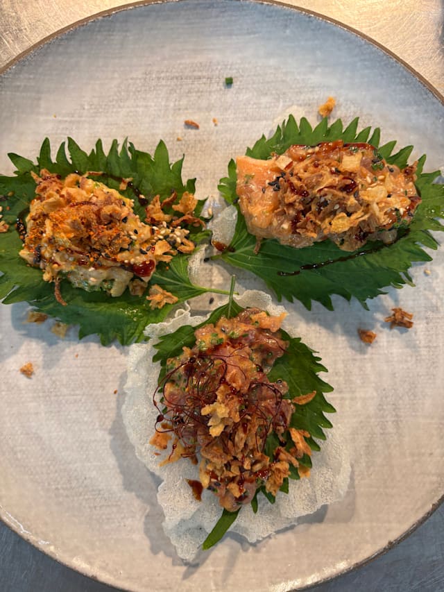 Rouges d’argentine panko et saumon laqué, fromage, avocat, tartare de gambas, coriandre ,œufs de poissons, pickles de moutarde