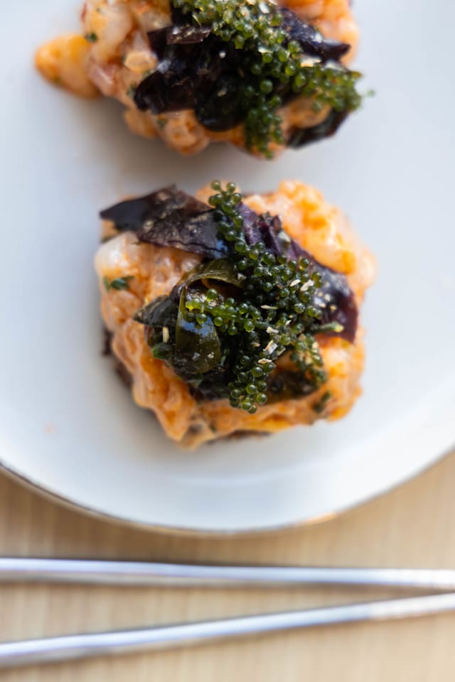 Cuisson barbecue japonais, mayonnaise hondashi, sauce ponzu, gelée de citron, raisins de mer