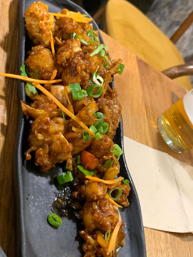 Fresh prawns marinated in soya, chilli sauces and tossed with onion, capsicum.