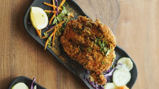 Deep fried chicken with fried urid dal powder and south indian masalas